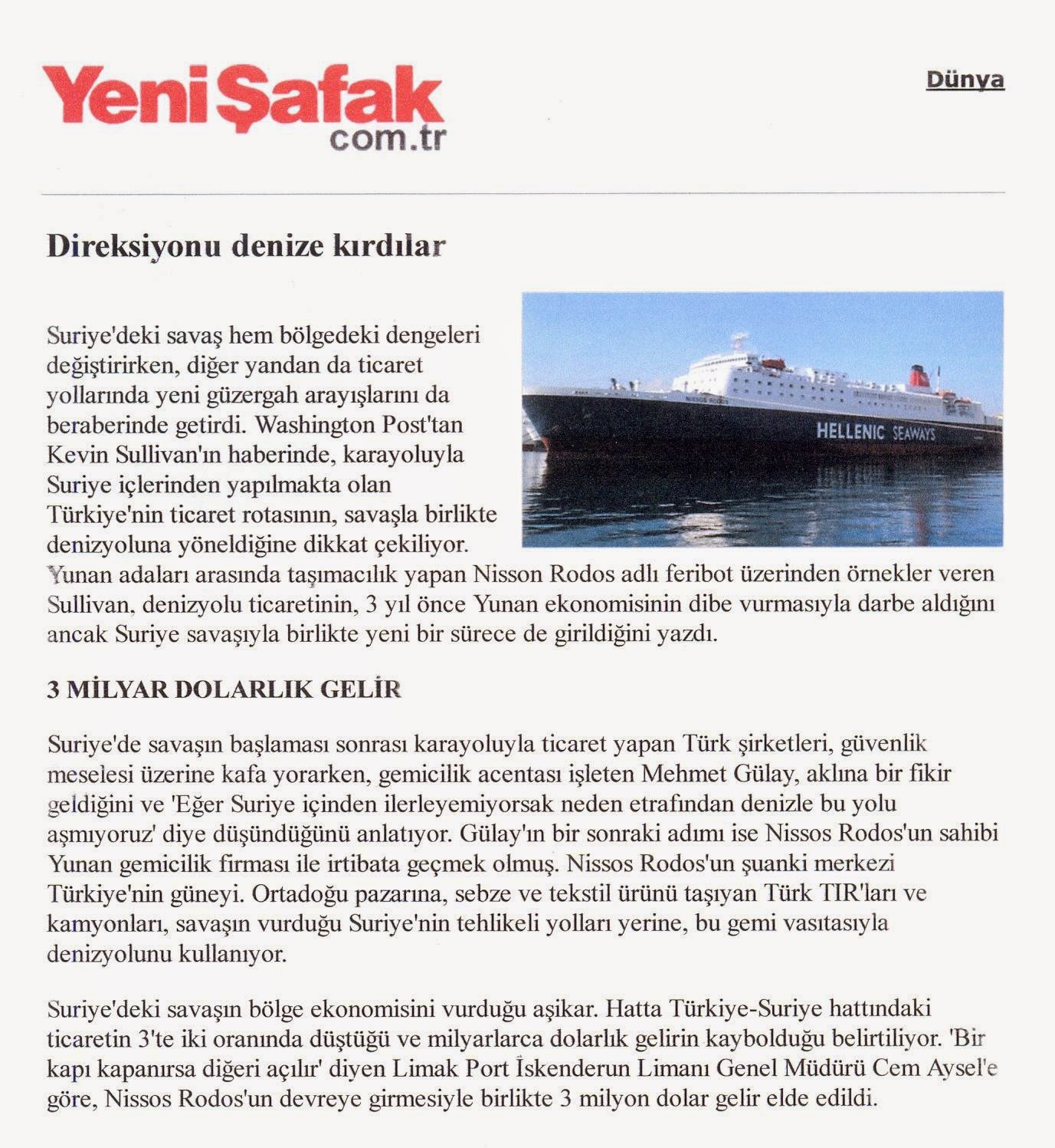 Ο εμφύλιος πόλεμος στην Συρία και τα γεγονότα στην Αίγυπτο έχουν προκαλέσει σοβαρά προβλήματα στις τουρκικές εξαγωγές σε χώρες νότια της Συρίας και κυρίως στην Σαουδική Αραβία και στην Ιορδανία. Το πρόβλημα αυτό που στοιχίζει στους Τούρκους εκατομμύρια δολάρια όπως φαίνεται το έλυσε ένα ελληνικό φεριμπότ.