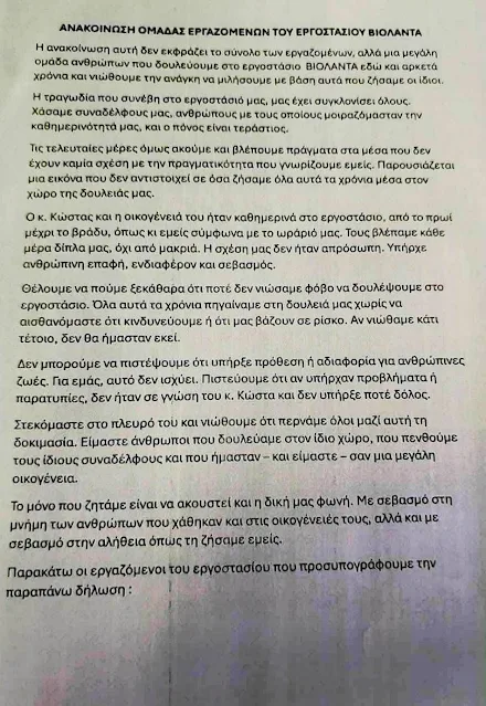Πρόκειται ξεκάθαρα για μια δόλια και βρώμικη προσπάθεια της διοίκησης και της υπεράσπισης του Τζιωρτζιώτη να συγκαλύψουν τις εγκληματικές ευθύνες του για τη φονική έκρηξη στο εργοστάσιο της Βιολάντα στα Τρίκαλα, που είχε ως αποτέλεσμα τον ακαριαίο θάνατο 5 εργατριών. Πρόκειται για μια εργοδοτική εκστρατεία σπίλωσης της μνήμης των νεκρών και εκμετάλλευσης του ανθρώπινου πόνου, και όσοι συμμετέχουν σε αυτή από οποιαδήποτε θέση, είναι συνένοχοι και φέρουν τις αντίστοιχες ευθύνες.